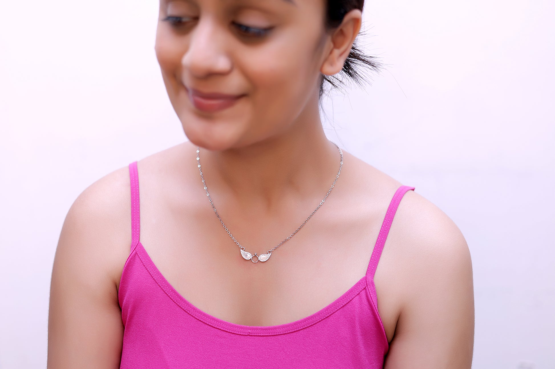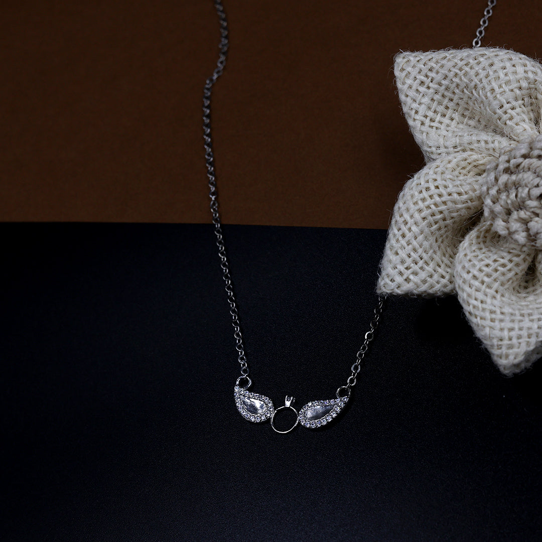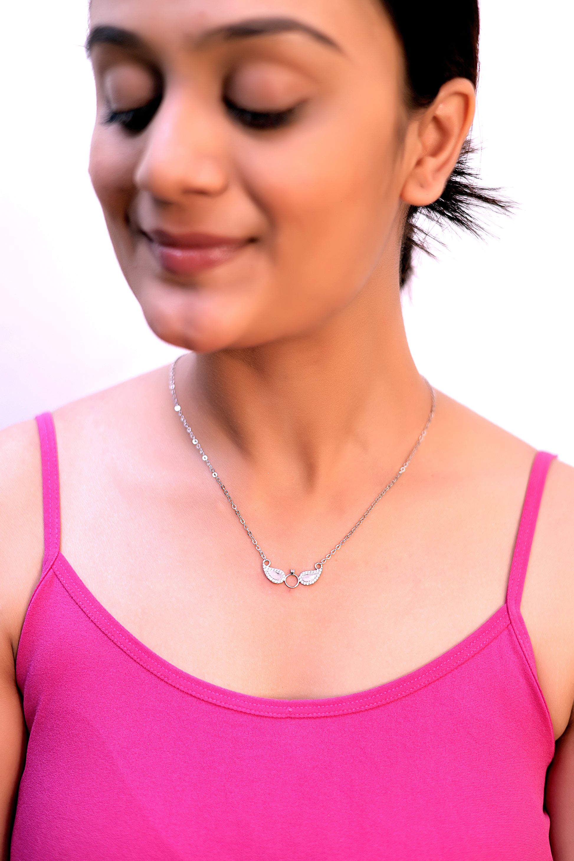 Embrace ethereal beauty with the Angelic Wings Diamond Necklace — a delicate design that blends a winged motif with radiant sparkle. Featuring a pendant with two teardrop shapes adorned with pavé-set diamonds, resembling angelic wings around a central circle, set in a polished silver chain, this necklace offers a perfect fusion of whimsical charm and timeless elegance, tailored for the Indian market.
