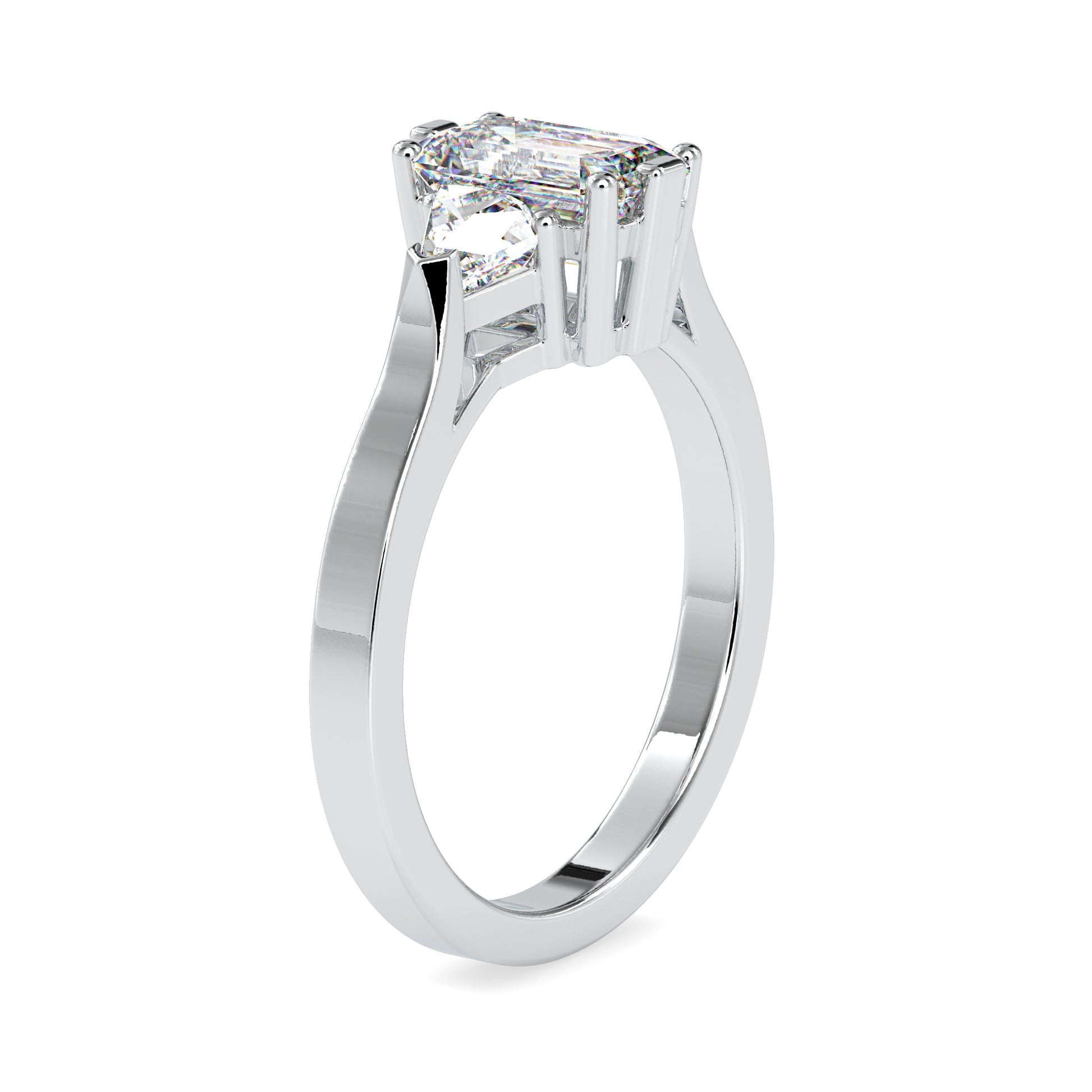 Three-Stone Design: An emerald-cut center diamond paired with two brilliant side stones for added sparkle.