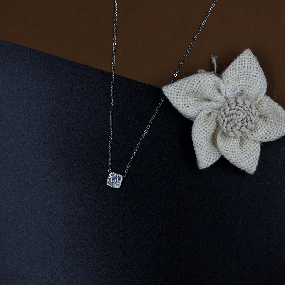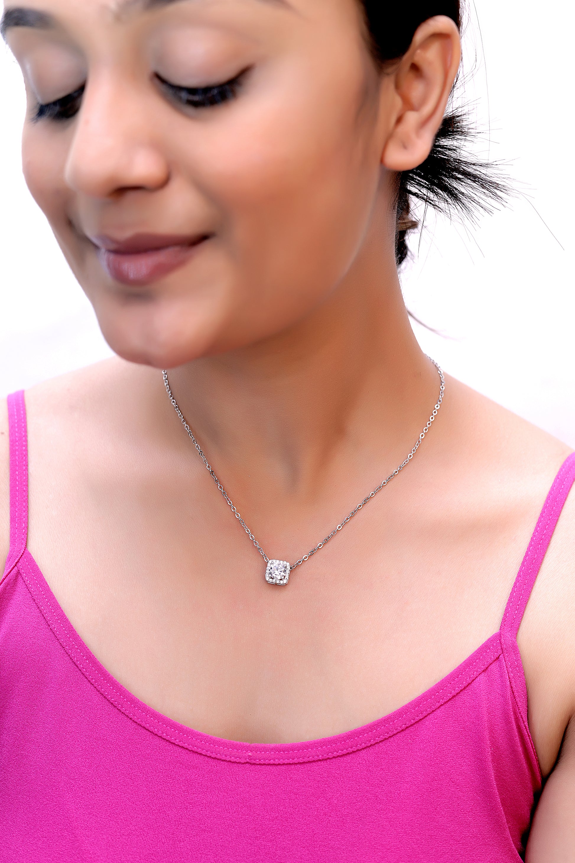 Elevate your elegance with the Refined Square Halo Necklace — a sleek design that blends geometric precision with radiant sparkle. Featuring a square-shaped pendant with a central diamond encircled by a halo of pavé-set diamonds, set in a polished silver chain, this necklace offers a perfect fusion of modern sophistication and timeless charm, tailored for the Indian market.